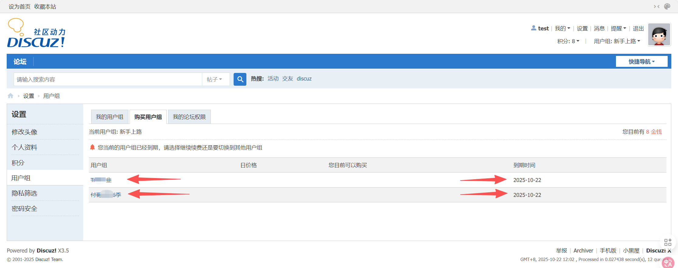 [已解決] 當擴展用戶組到期后,該用戶登錄就直接跳轉至“設置-用戶組-購買用戶組”的頁面,并且無法跳轉其他頁面了 |